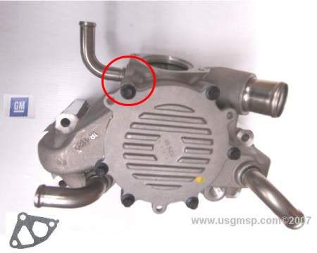 OK guys here's a good one. My water pump has developed a leak right where the heater hose fitting connects to the water pump. Seems like I remember a post for this but I searched and couldn't find it. The fitting is leaking right where it mates up to the pump. Anyone have an innovative fix for this other than a new water pump? I circled the leaking fitting in the pic below. Thanks for any suggestions.